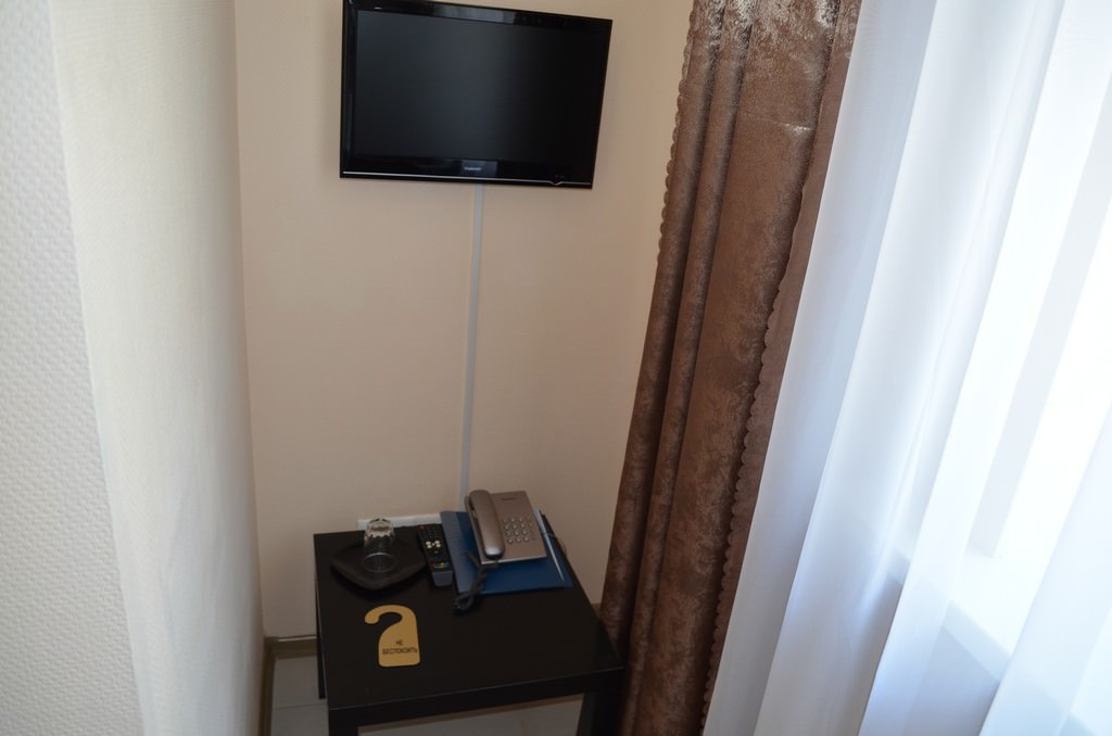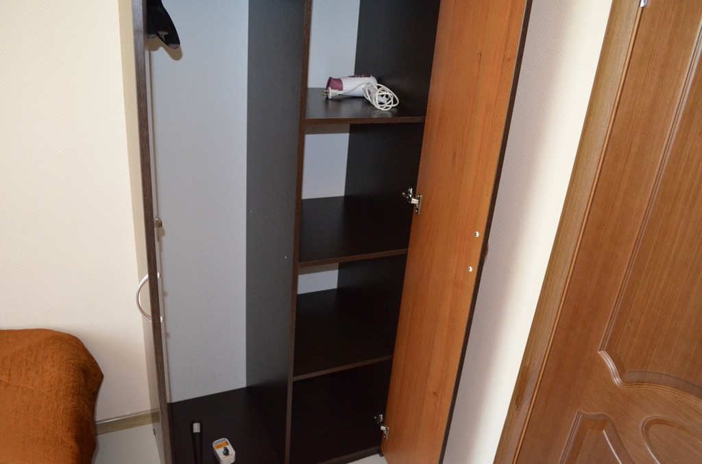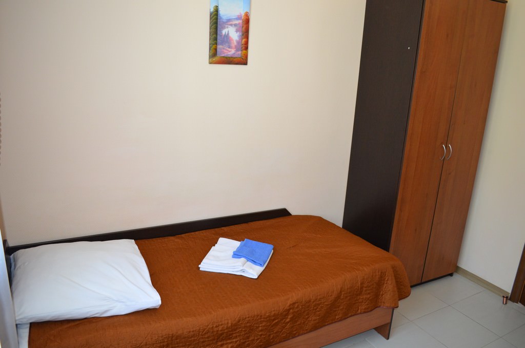 1 осн. место. Мебель: вешалка, зеркало, кровать односпальная, прикроватная тумбочка, столик туалетный, стул, шкаф. Оборудование: набор посуды (стаканы (предусмотрен кулер с водой на этаже)), телевизор, телефон, холодильник (на этаже). Санузел: с душем, туалетные принадлежности, фен. Сервис: смена полотенец (по требованию/либо раз в 5-6 дней), смена постельного белья (по требованию/либо раз в 5-6 дней), уборка номера (ежедневно).